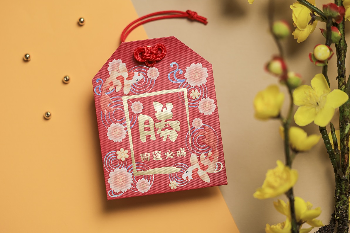 「錦鯉迎春御吉祥」利是封以六種春日色彩包括:粉紅、暖橙、天藍、雅紫、豔紅、墨綠為主調,各自配上不同祝福句:「幸福美滿」、「財運滾滾」、「好運降臨」、「學業進步」、「開運必勝」與「健康長壽」,象徵「六六大順」的吉祥美意。加上每款封面均有一對錦鯉悠游,寓意新一年如魚得水、平安順遂。御守的造型更蘊含守護祝福之意,再配合燙金與雷射效果,閃耀如同新年的金光,再搭配人手編織平安結,並選用和風紋紙,觸感細膩而立體,光影流轉間盡顯新春的喜慶與雅致。